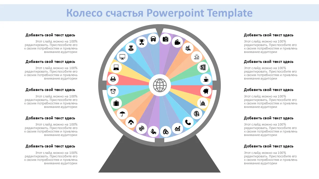 Визуально привлекательный шаблон Powerpoint «Колесо фортуны», предназначенный для ясного представления данных, процессов и ключевых показателей. Идеально подходит для презентаций бизнес-стратегий, предложений клиентов и встреч команды. Полностью редактируемый и готовый к печати.