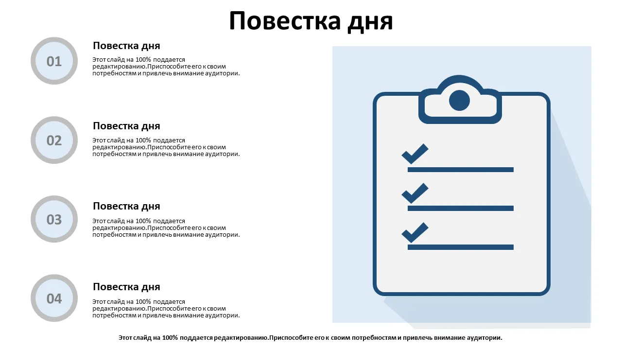 Профессионально разработанные темы повестки дня для презентаций на собраниях. Редактируемые слайды с современным дизайном, идеально подходящие для бизнес-профессионалов, консультантов и команд. Чистая планировка, готовая к настройке.