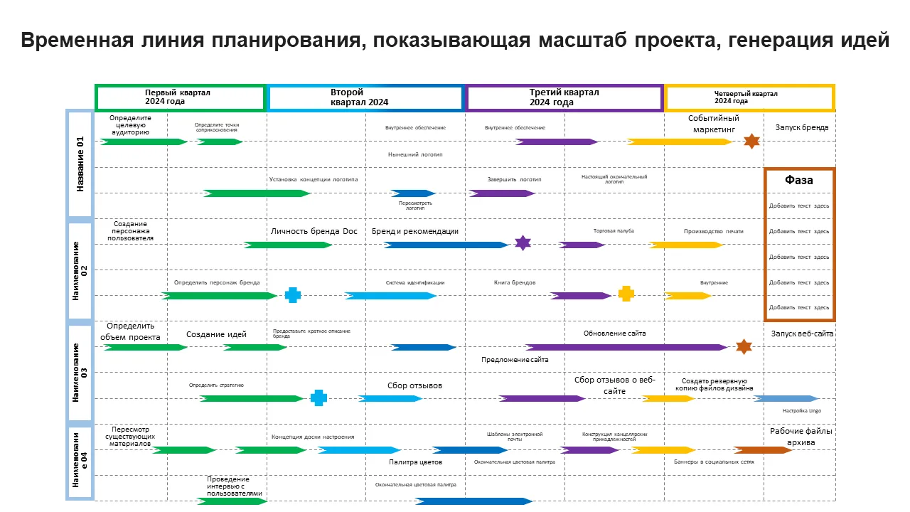Визуализируйте масштаб проекта и сроки генерации идей с помощью этого профессионального шаблона PowerPoint. Идеально подходит для стратегического планирования, разработки дорожных карт и координации команды.