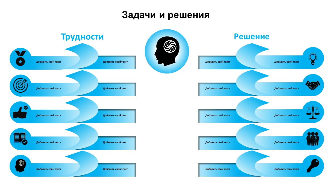Чистый, профессиональный шаблон PowerPoint, предназначенный для визуального представления бизнес-задач и соответствующих решений. Идеально подходит для стратегического планирования, обзоров руководителей и консультационных презентаций.