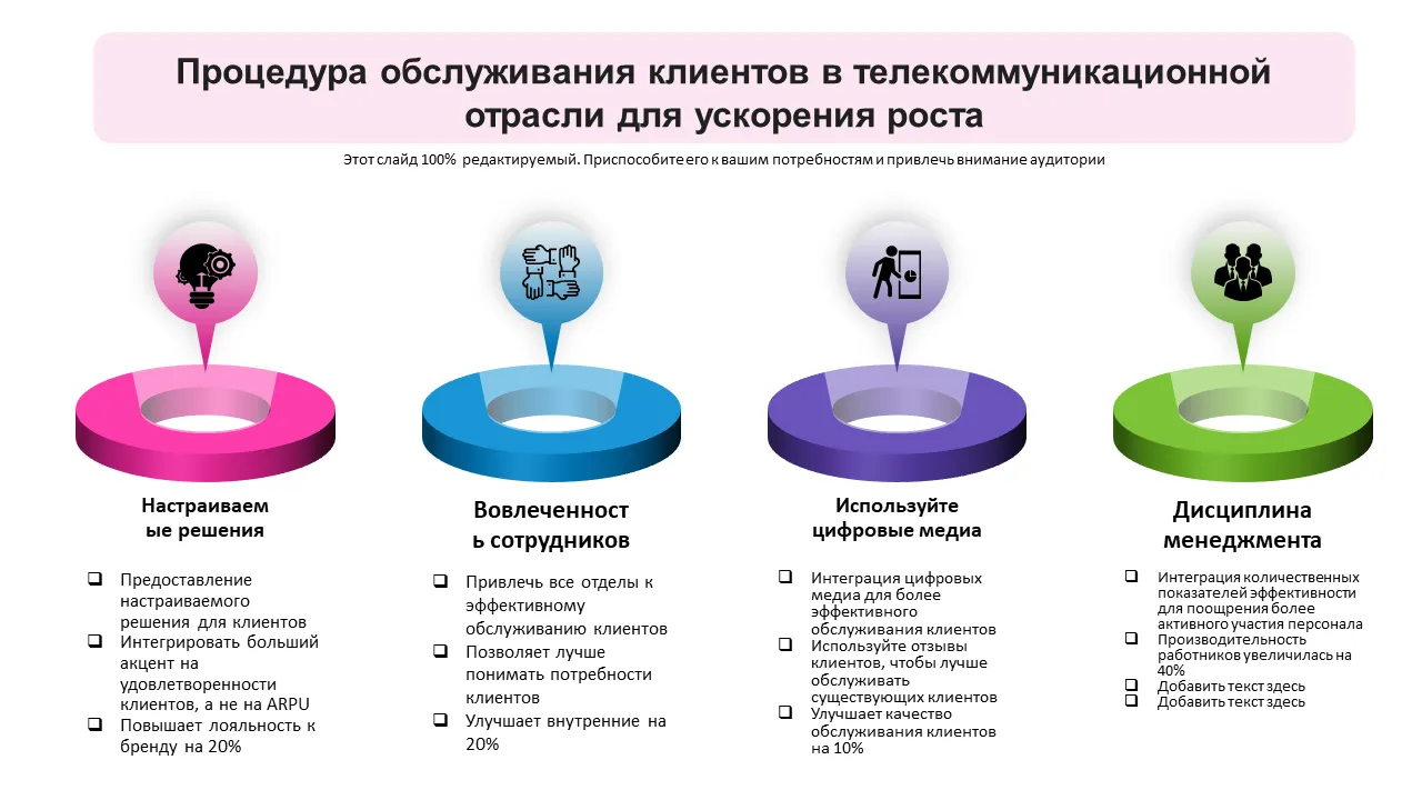 Повысьте удовлетворенность клиентов в сфере телекоммуникаций и лояльность к бренду с помощью этого редактируемого шаблона PowerPoint, ориентированного на процедуры обслуживания клиентов для ускорения роста бизнеса.