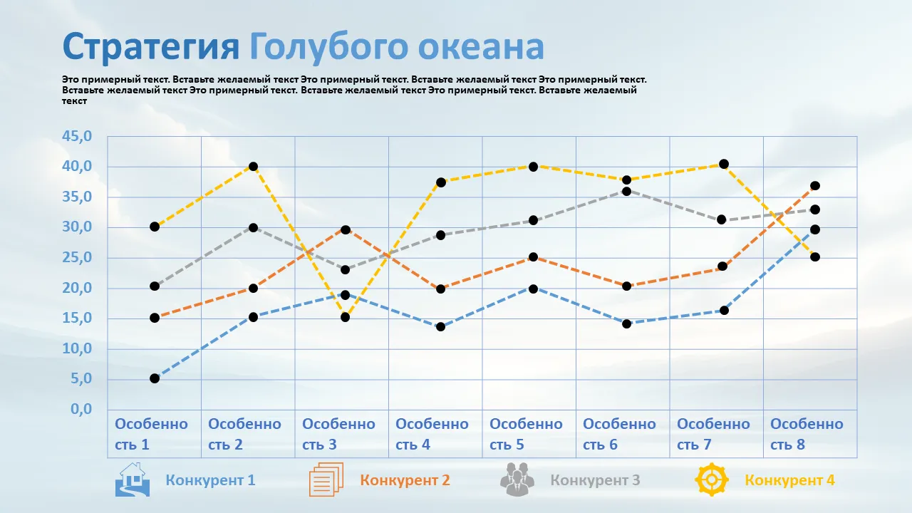 Визуально привлекательный шаблон Blue Ocean Strategy Canvas, предназначенный для презентаций по развитию бизнеса. Идеально подходит для стратегического планирования, дифференциации рынка и конкурентного анализа. Загрузите сейчас.