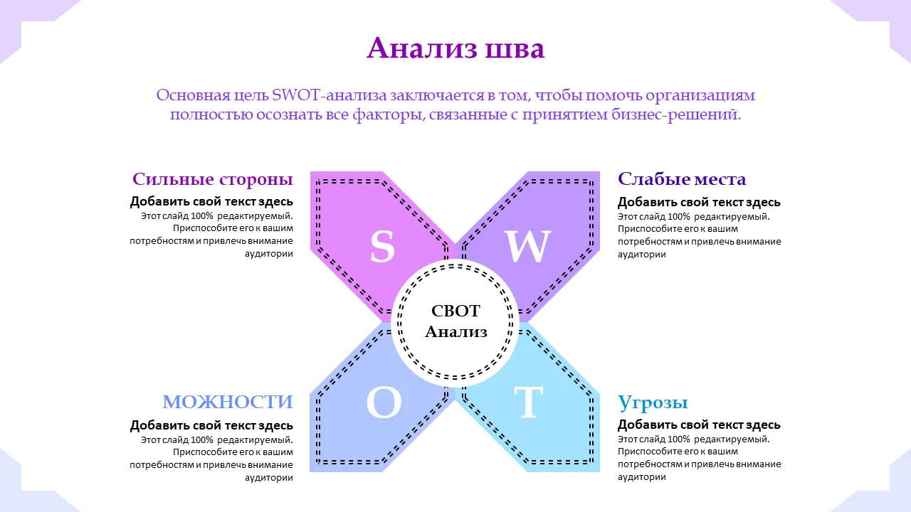 Профессионалы бизнеса в сфере консалтинга, корпоративной стратегии и управления используют этот шаблон для представления стратегических оценок заинтересованным сторонам, инвесторам или внутренним командам. Это особенно ценно в таких отраслях, как финансы, технологии и здравоохранение, где стратегическое позиционирование имеет решающее значение. Команды, готовящиеся к ежеквартальным обзорам, новостям для инвесторов или новым выходам на рынок, получают выгоду от структурированного подхода к оценке конкурентной среды и внутренних возможностей. Он также хорошо подходит для стартапов и масштабных компаний, которым необходимо сформулировать свое стратегическое позиционирование потенциальным партнерам или источникам финансирования.