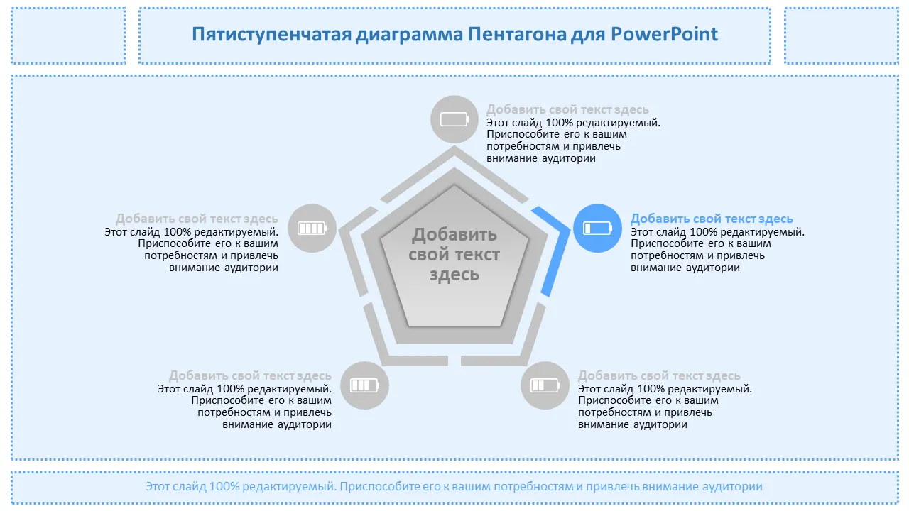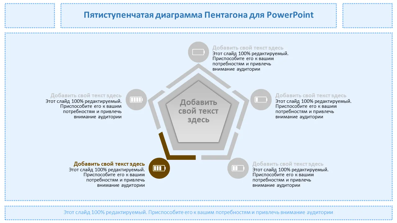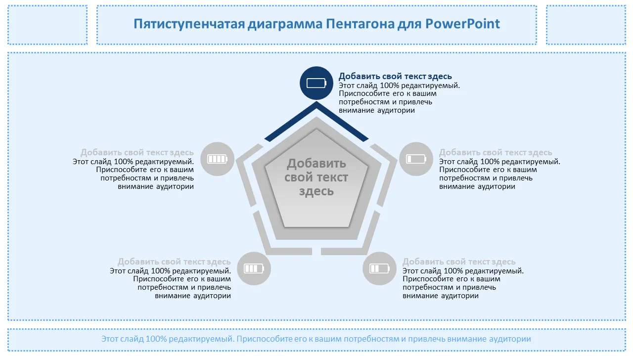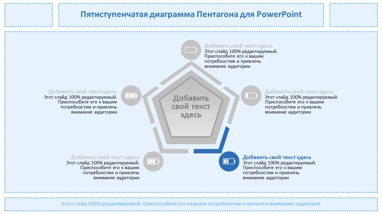 Этот профессиональный шаблон PowerPoint представляет собой динамическую пятиугольную диаграмму, предназначенную для визуального представления пяти последовательных шагов в любом стратегическом процессе. Идеально подходит для бизнес-стратегии, планирования дорожных карт или визуализации рабочих процессов. Он помогает представить сложные идеи в простом и запоминающемся формате. Чистый макет и современный дизайн делают его подходящим для руководителей и межфункциональных команд.