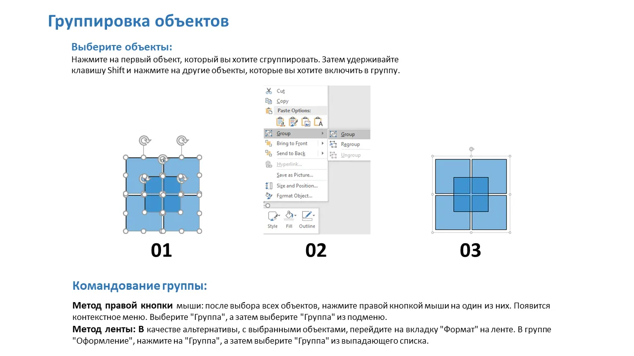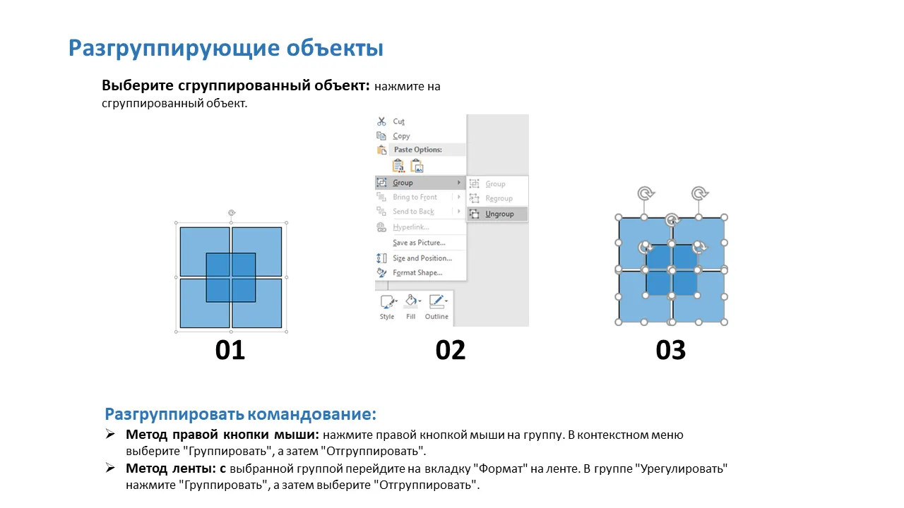 - Включает инструкции по группировке и разгруппировке для расширенного манипулирования слайдами.