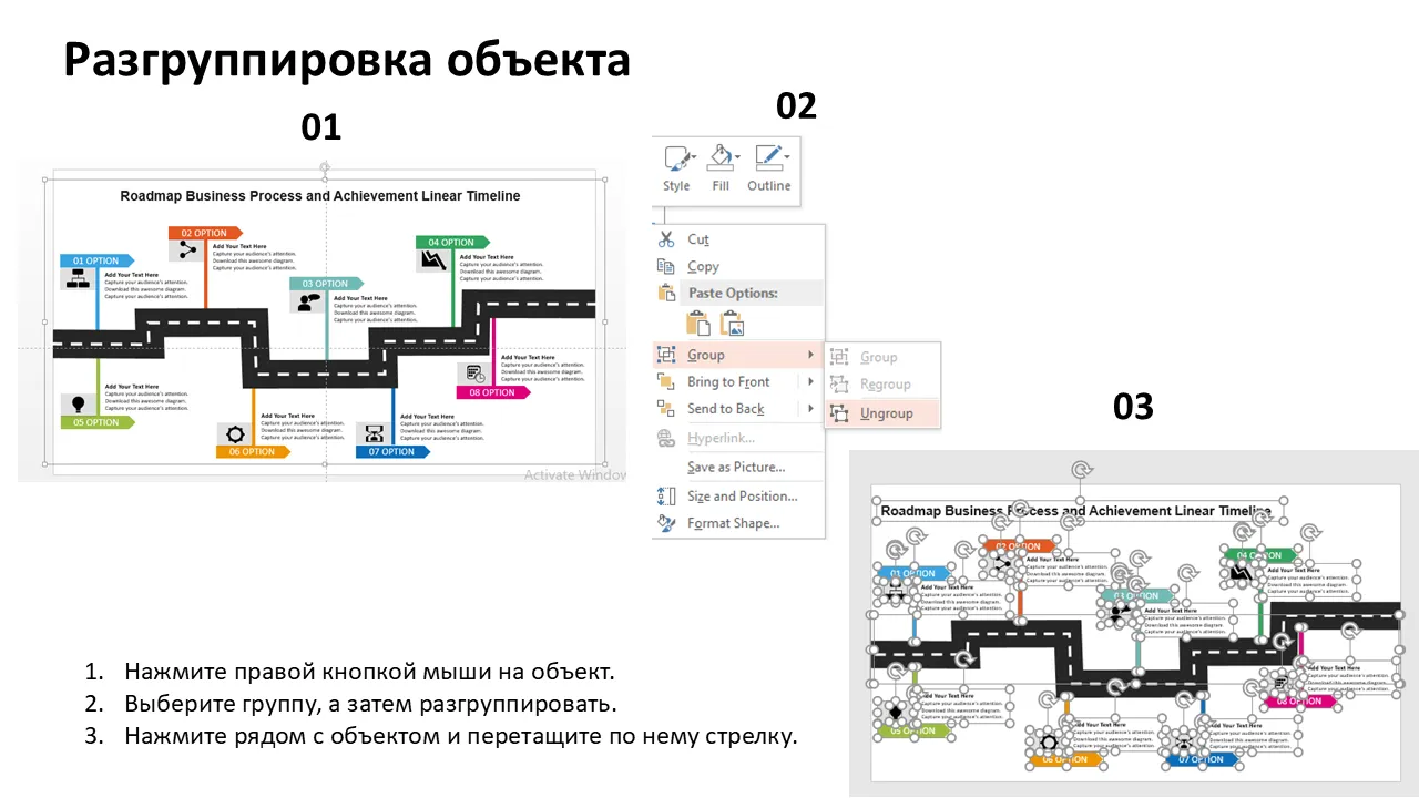 - Редактируемые маркеры вех с текстовыми заполнителями для ключевых результатов.