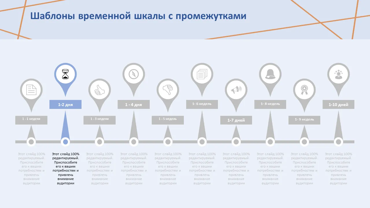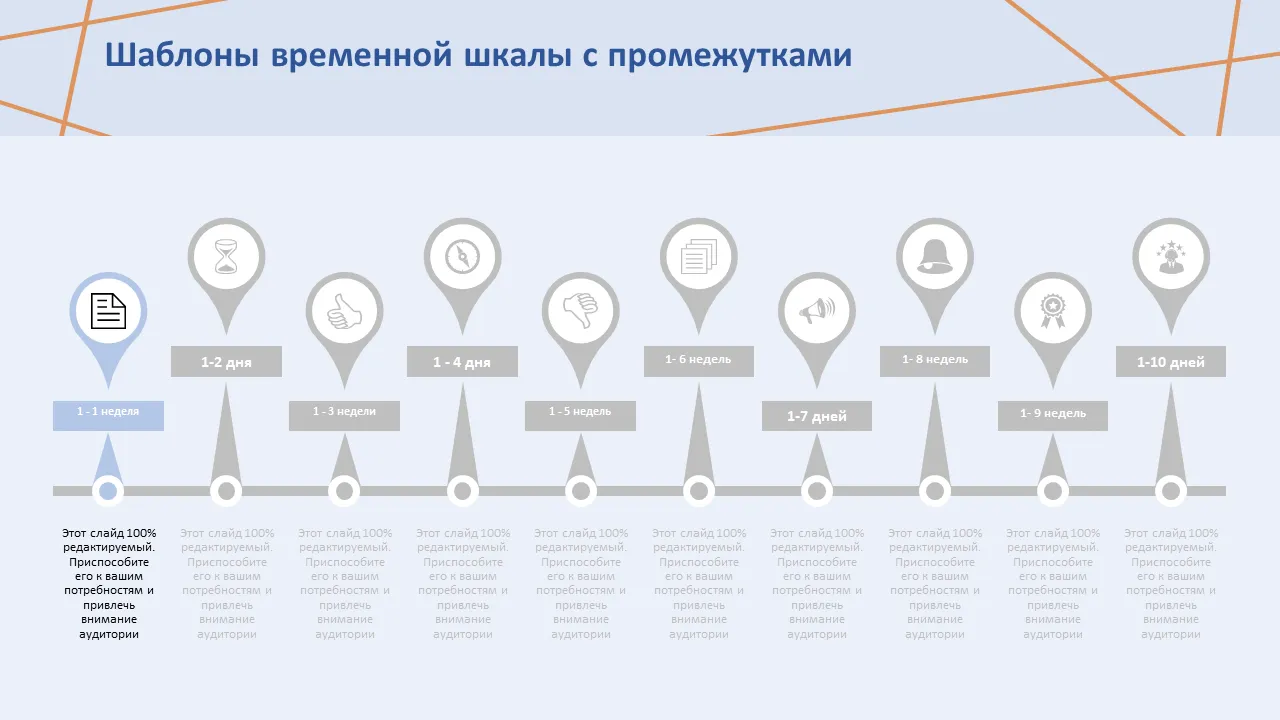 Этот профессиональный шаблон PowerPoint создан, чтобы помочь командам визуализировать сроки, основные этапы и поэтапное выполнение проекта с помощью встроенных пробелов и маркеров периодов. Он поддерживает стратегическое планирование, позволяя пользователям визуально четко намечать этапы проекта, рассчитанные на несколько недель или несколько дней. Шаблон идеально подходит для менеджеров проектов, продуктовых команд и руководителей, которым необходимо эффективно доносить сроки реализации между отделами.