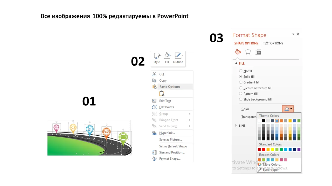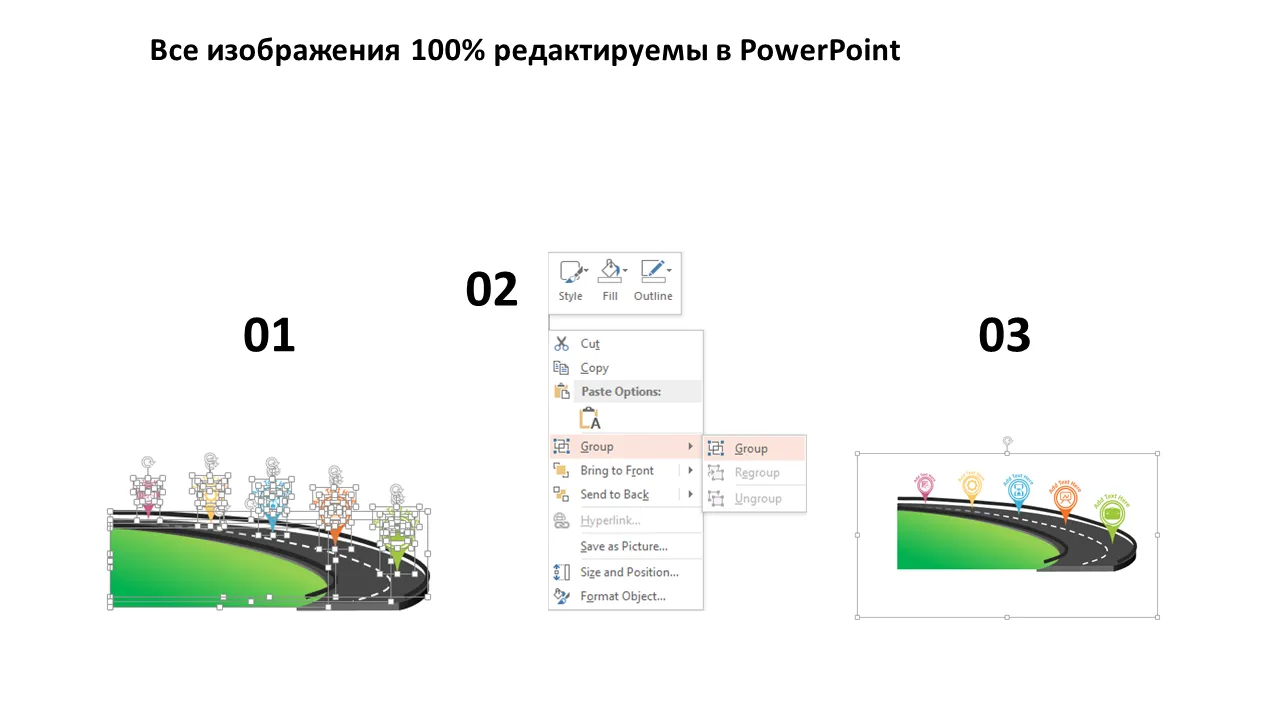 - Предварительно разработанные макеты инфографики для пошаговых процессов