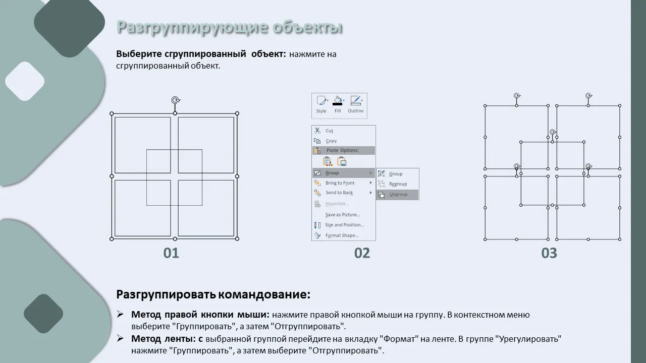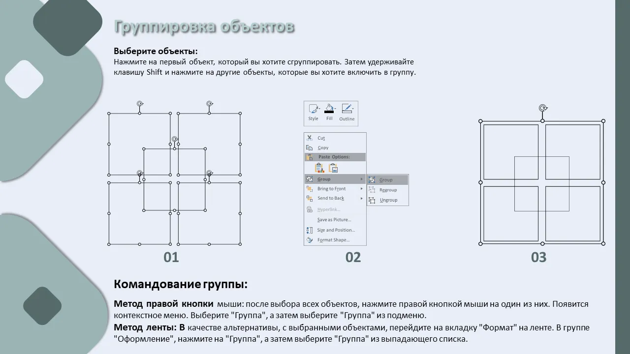 - Включает инструкции по группировке и разгруппированию элементов для расширенного редактирования.