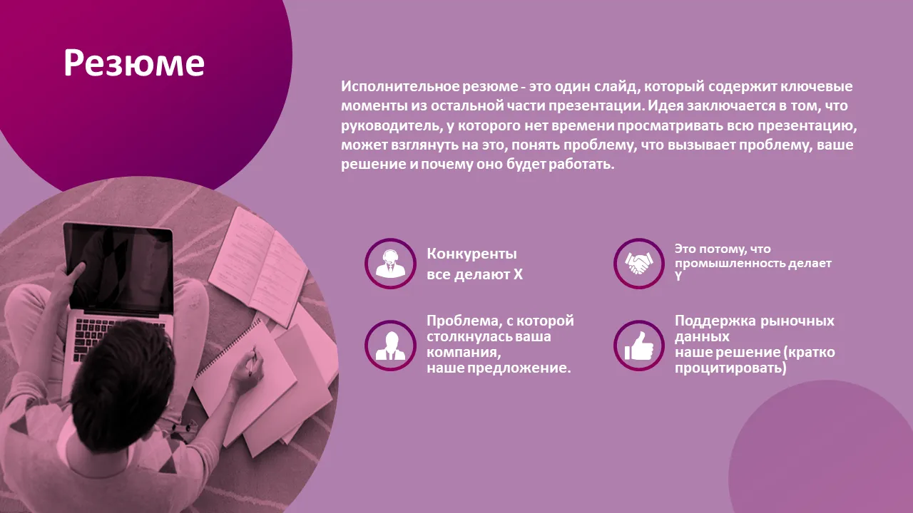 - Слайд с кратким обзором, предназначенный для понимания занятыми руководителями в последнюю минуту.