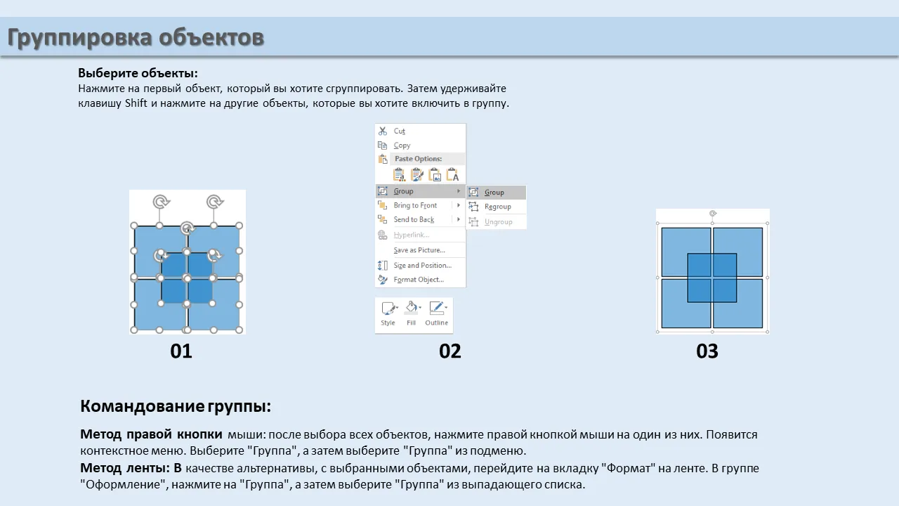 - Включает инструкции по эффективной группировке и расположению элементов.