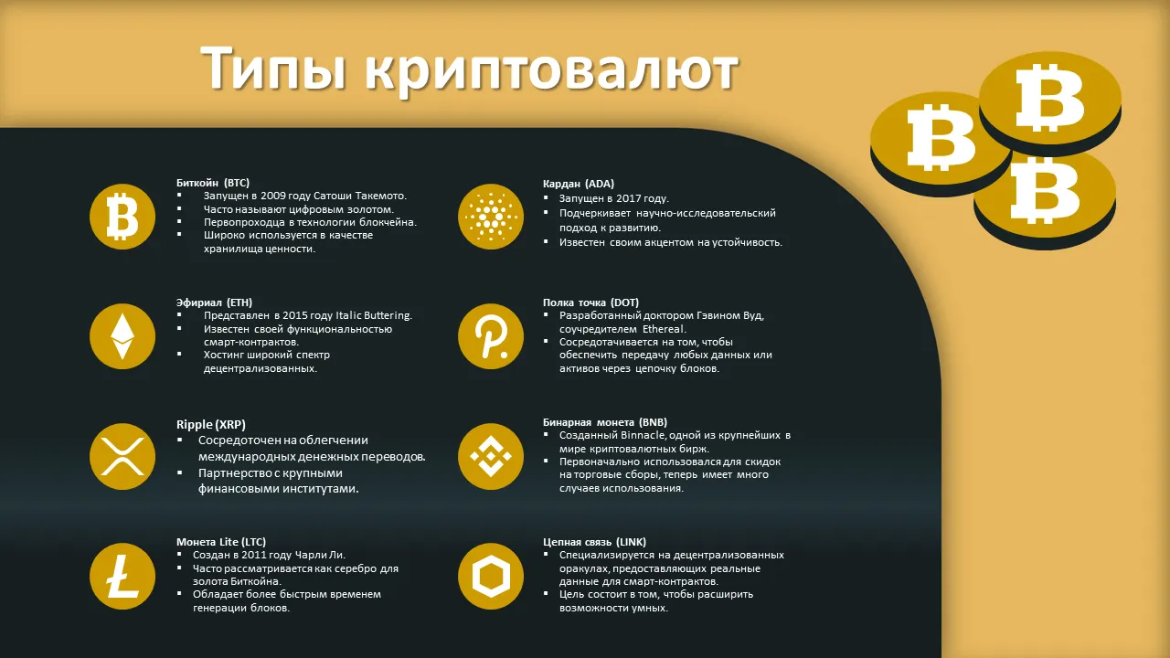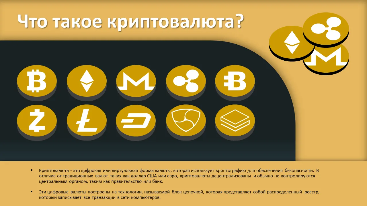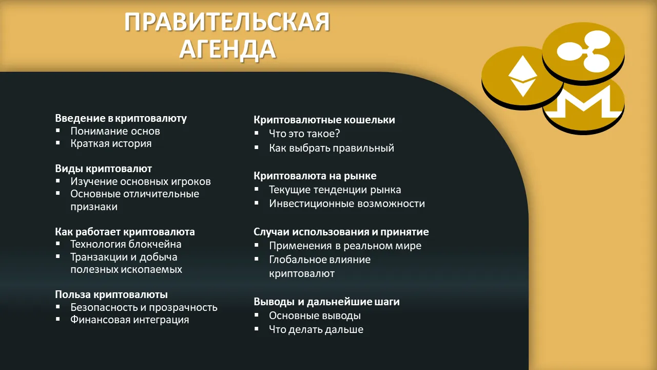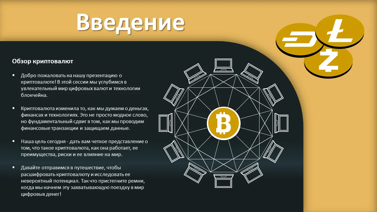 - Предварительно созданные слайды с обзором криптовалюты, ее преимуществами, рисками и будущими тенденциями.