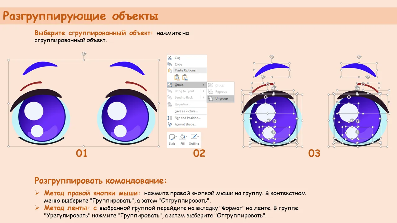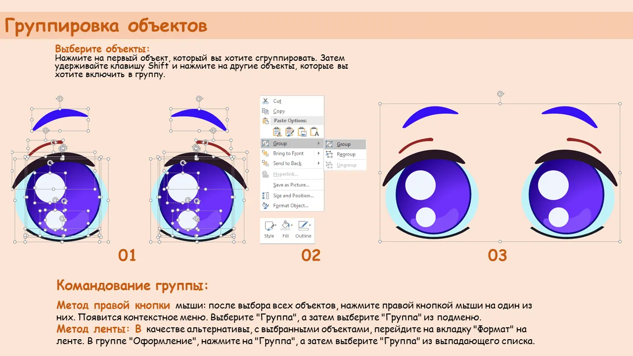 - Совместимость со стандартными инструментами редактирования PowerPoint, включая группировку правой кнопкой мыши и команды ленты