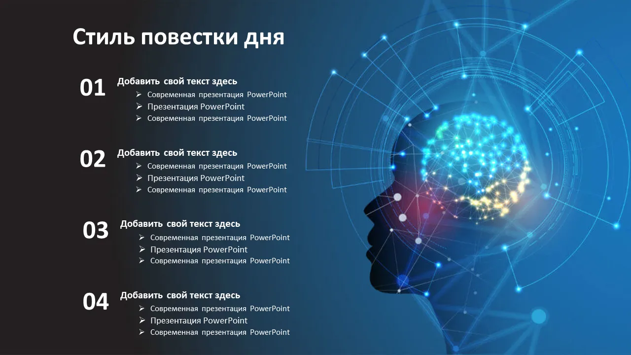 - Модульная структура слайдов для легкой настройки контента разделы