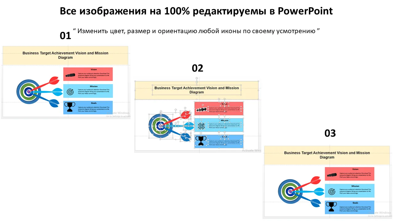 - Настраиваемый макет диаграммы с редактируемыми текстовыми полями для описания видения и миссии
