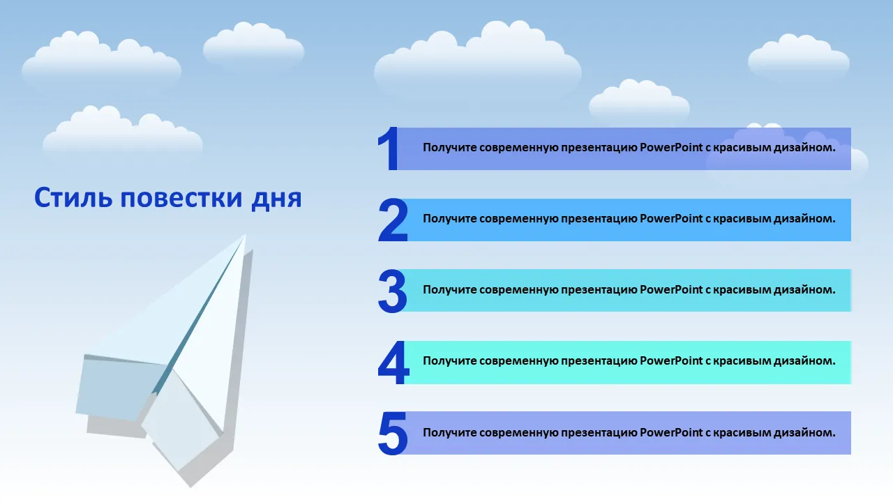 - Разметка слайдов в стиле повестки дня для четкой структуры презентации и руководства для аудитории.