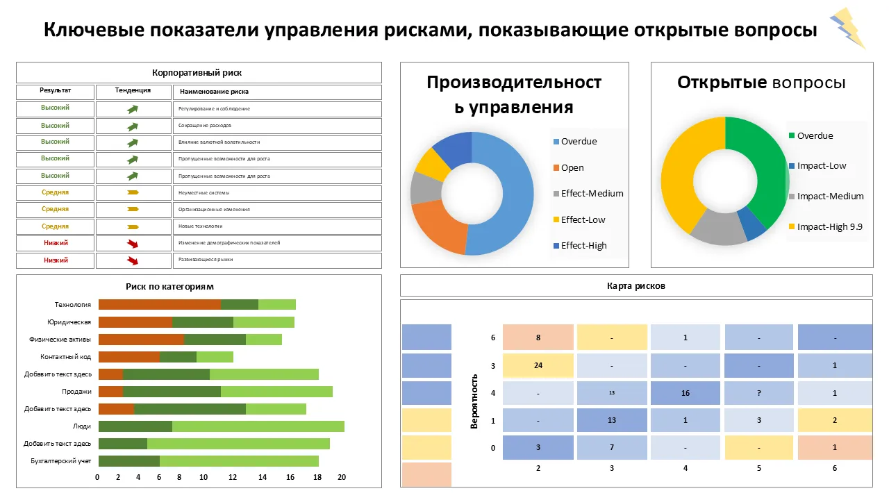 Панель управления рисками KPI, показывающая открытые проблемы и эффективность контроля. Шаблон PowerPoint для профессиональных презентаций
